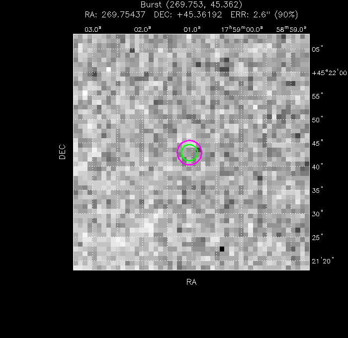 The image below shows the UVOT field with the final, astrometrically corrected XRT refined position. The image is 50" to a side, and contains 181 s of data in the B filter.