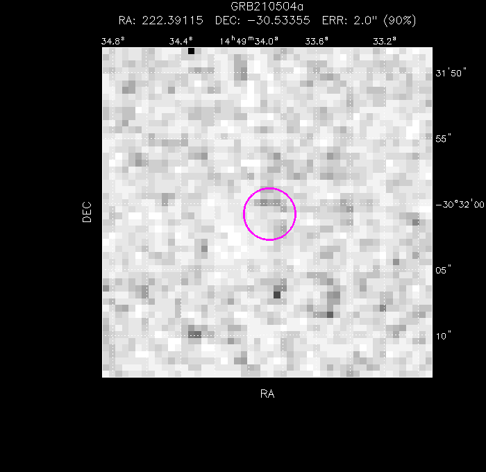 The image below shows the UVOT field with the final, astrometrically corrected XRT refined position. The image is 50" to a side, and contains 188 s of data in the V filter.