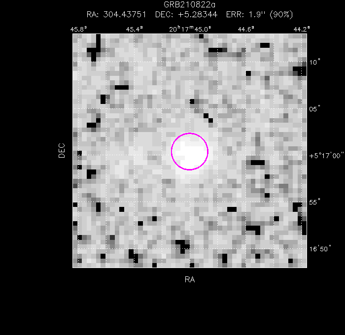 The image below shows the UVOT field with the final, astrometrically corrected XRT refined position. The image is 50" to a side, and contains 77 s of data in the V filter.