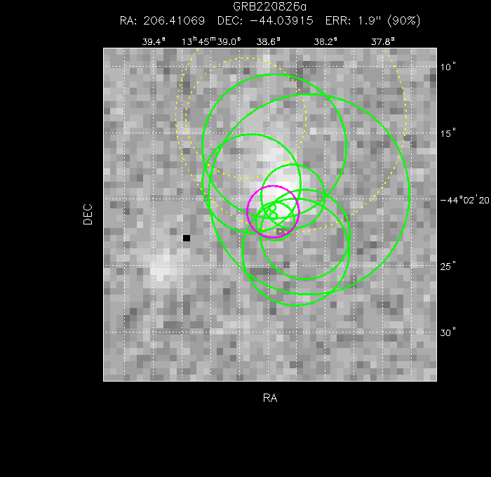 The final position (magenta) is the weighted mean of 9 positions (green). A further 2 positions were rejected, either because they had too few photons to be secure (red) or because they are more than 3 sigma away from the mean position, more than 40" from the early mean, or had a problematic astrometric correction (yellow). The image is 50" to a side.