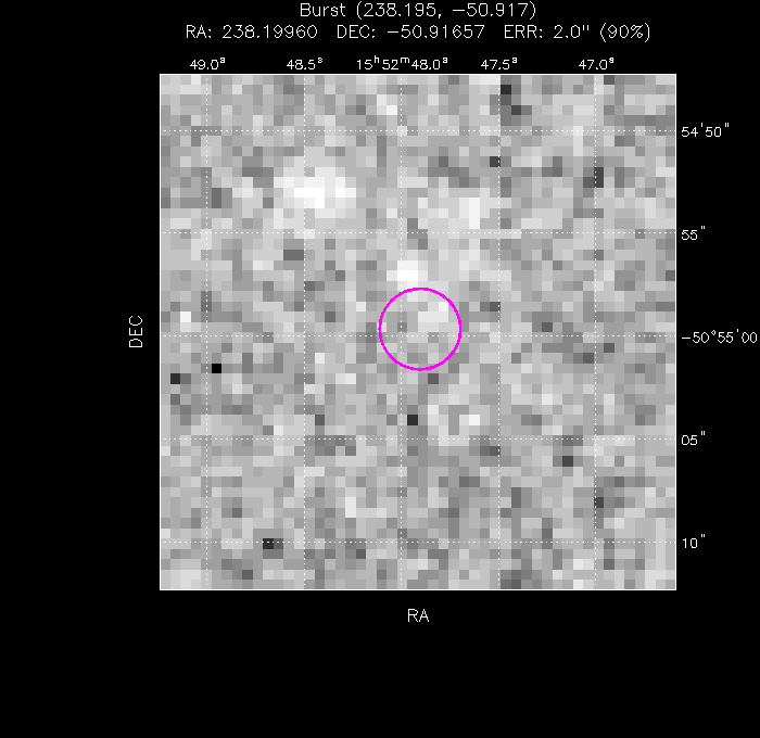 The image below shows the UVOT field with the final, astrometrically corrected XRT refined position. The image is 50" to a side, and contains 97 s of data in the B filter.