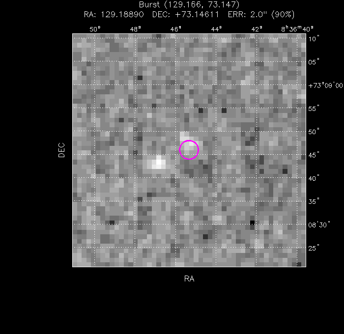 The image below shows the UVOT field with the final, astrometrically corrected XRT refined position. The image is 50" to a side, and contains 344 s of data in the WHITE filter.
