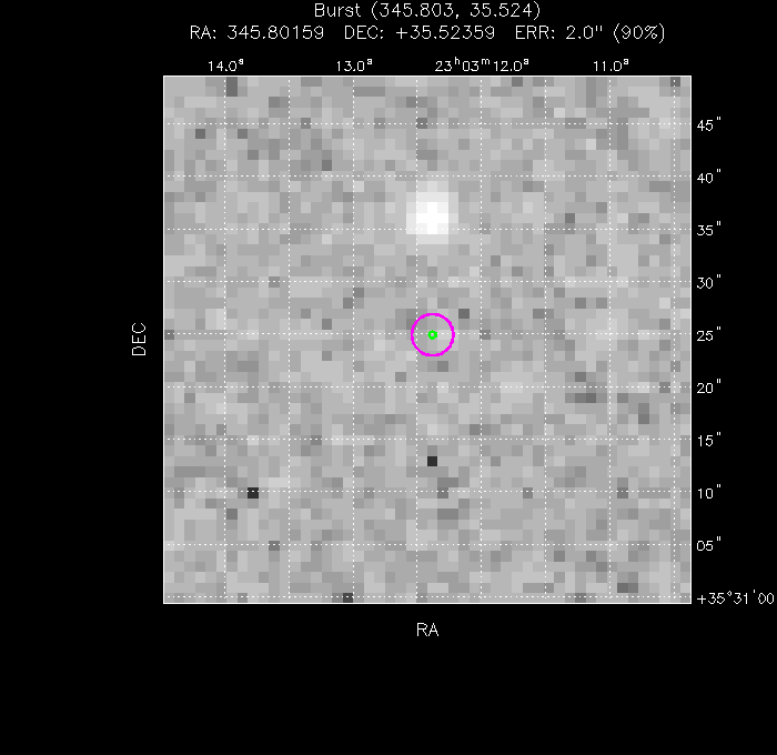 The image below shows the UVOT field with the final, astrometrically corrected XRT refined position. The image is 50" to a side, and contains 196 s of data in the V filter.